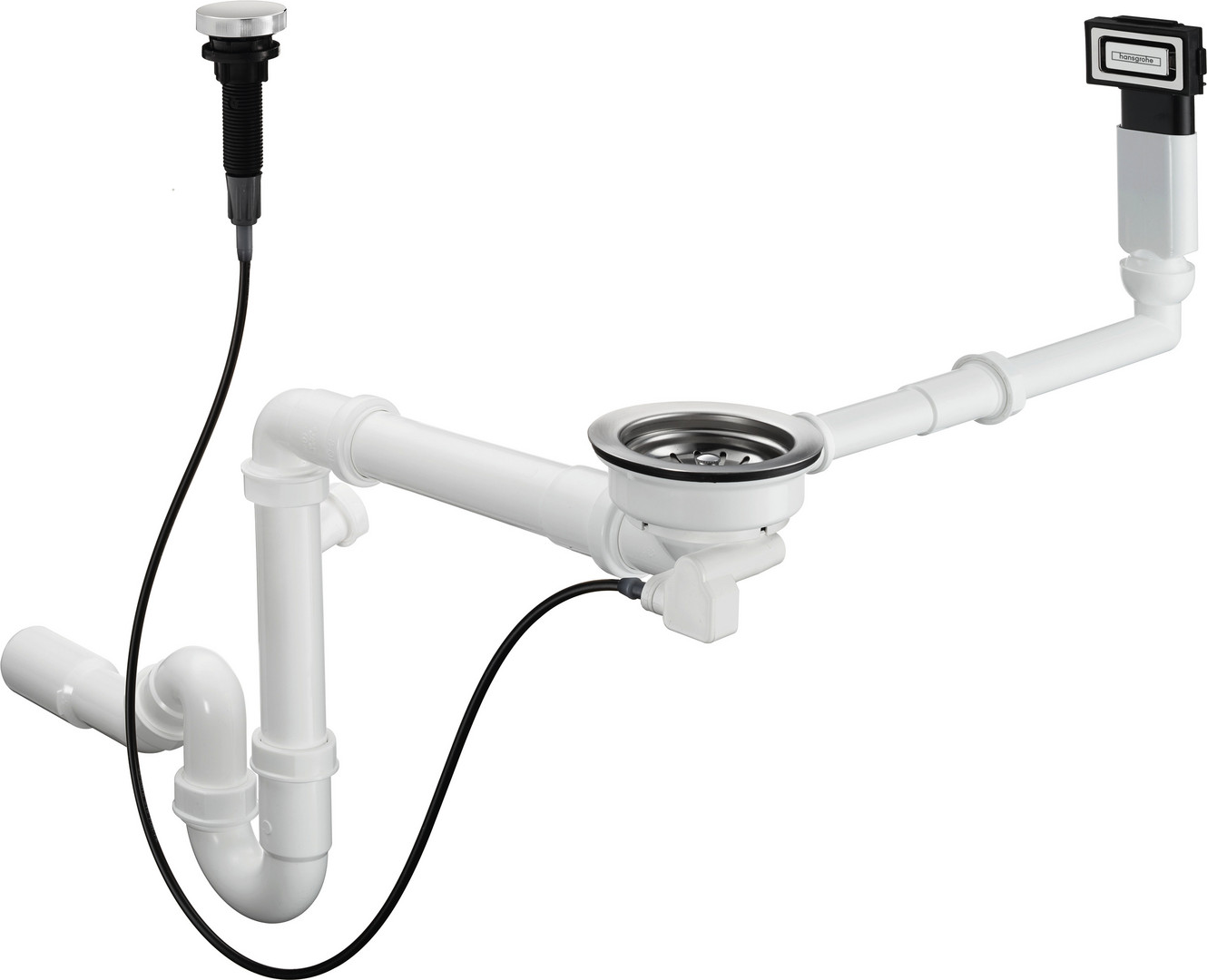 bestehend aus Ab- und Überlaufgarnitur, Exzenter-Ablaufventil, Siphon, Ablaufbedienung durch drehen am Exzenter, Ø 40/50 mm, 1 1/2" mit Raumsparablaufbogen und Röhrengeruchverschluss, Siebkorbventil 3 1/2"