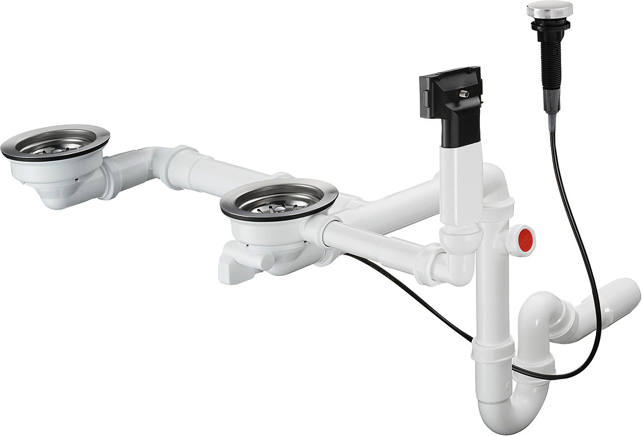 bestehend aus Ab- und Überlaufgarnitur, Exzenter-Ablaufventil, Siphon, Ablaufbedienung des Hauptbeckens durch drehen am Exzenter, beim Zusatzbecken durch drücken/ziehen am Siebkorb, Ø 40/50 mm, 1 1/2" mit Raumsparablaufbogen und Röhrengeruchverschluss, Siebkorbventil 3 1/2"