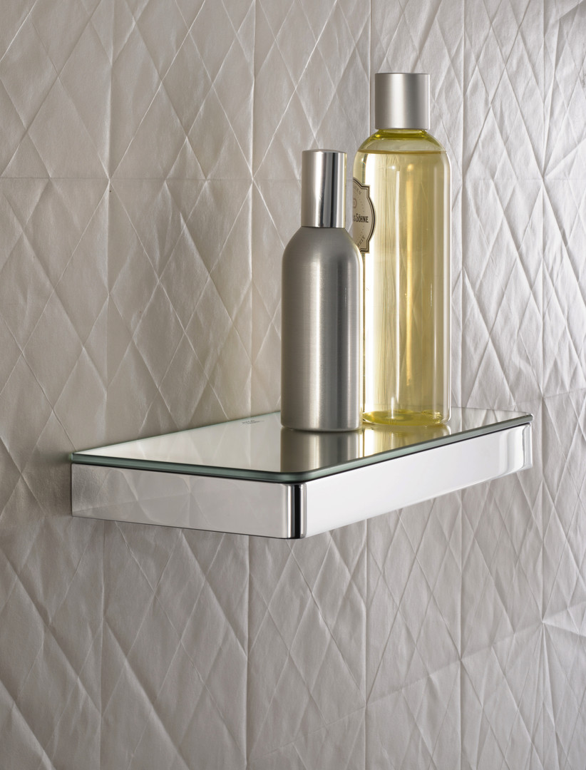 Material Rahmen Metall, Material Ablage Sicherheitsglas, mit Befestigungsmaterial, verdeckte Befestigung, für Dusche geeignet, Wandmontage, Durchmesser Bohrloch 6 mm, kombinierbar mit Toilettenpapierhalter # 42836xxx (Adapter # 42870xxx notwendig)