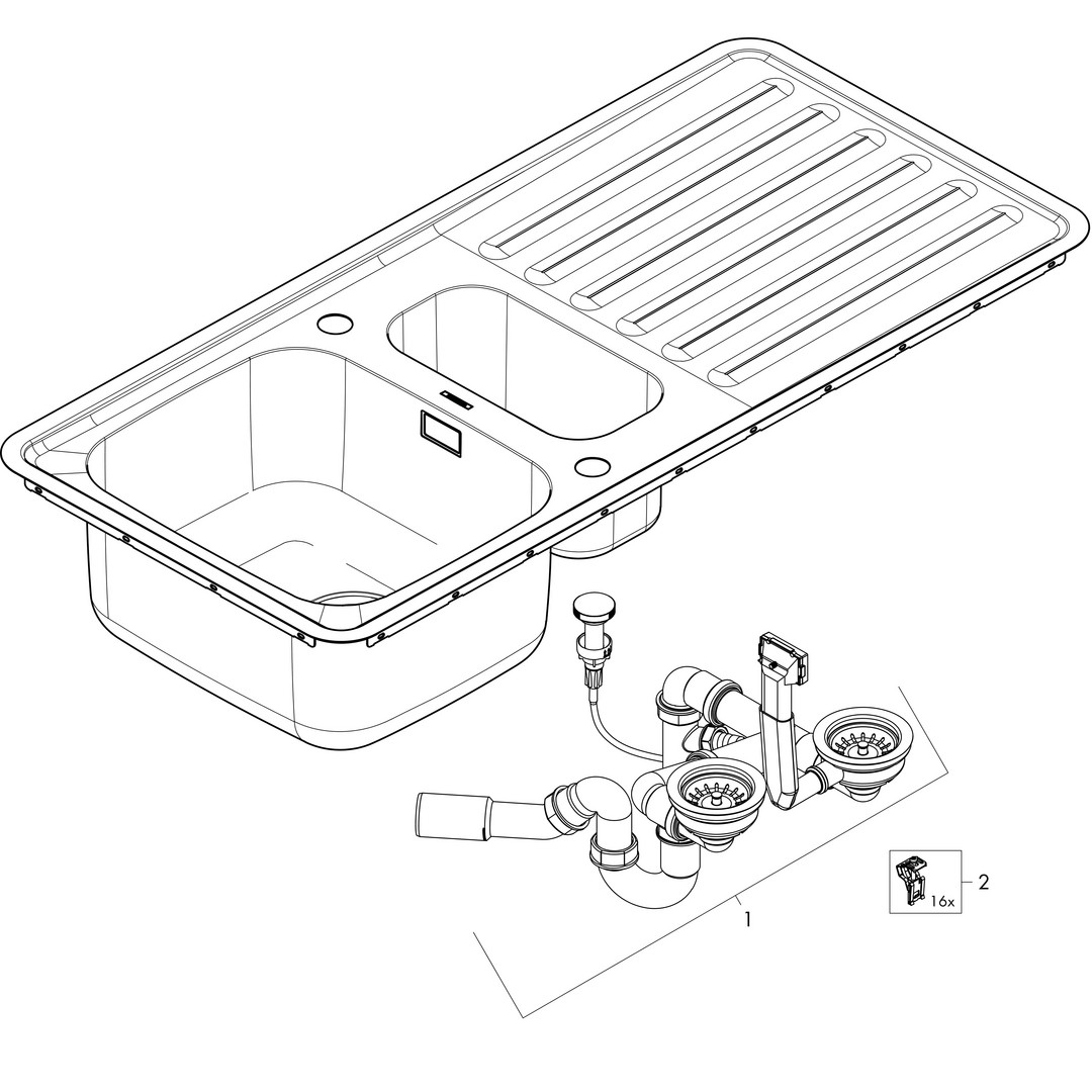 bestehend aus 1 Hauptbecken mit Abtropffläche, 1 Restebecken, manuelle Ablaufgarnitur mit Siphon, Hahnlöcher für Bohrung vordefiniert, ohne Hahnloch, Ausrichtung ist reversibel, Beckentiefe 210 mm, Tiefe Restebecken 160 mm, Unterschrank 600 mm, Einbauart flach aufliegend oder flächenbündig, Position Überlauf ist seitlich im Becken unter Abtropffläche, Armaturenbankverstärkung für einen festen und stabilen Sitz der Armatur, Eckradius 70 mm