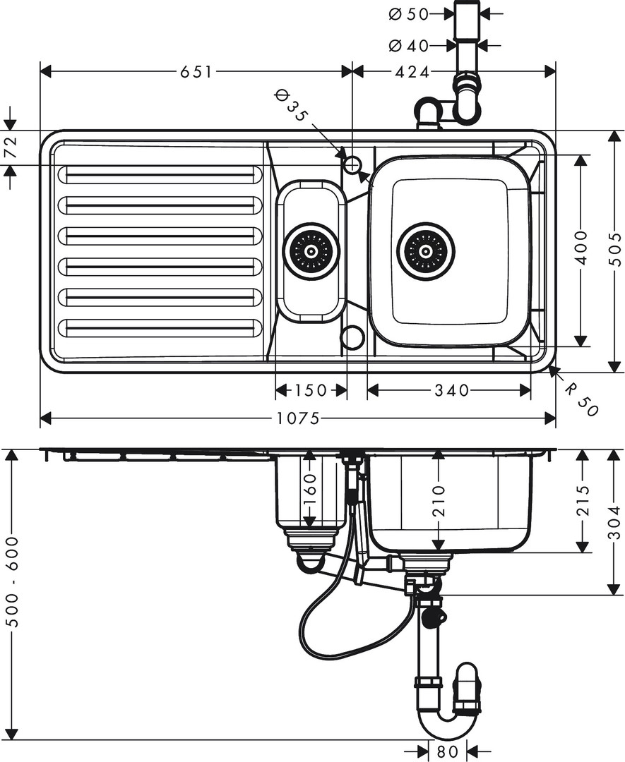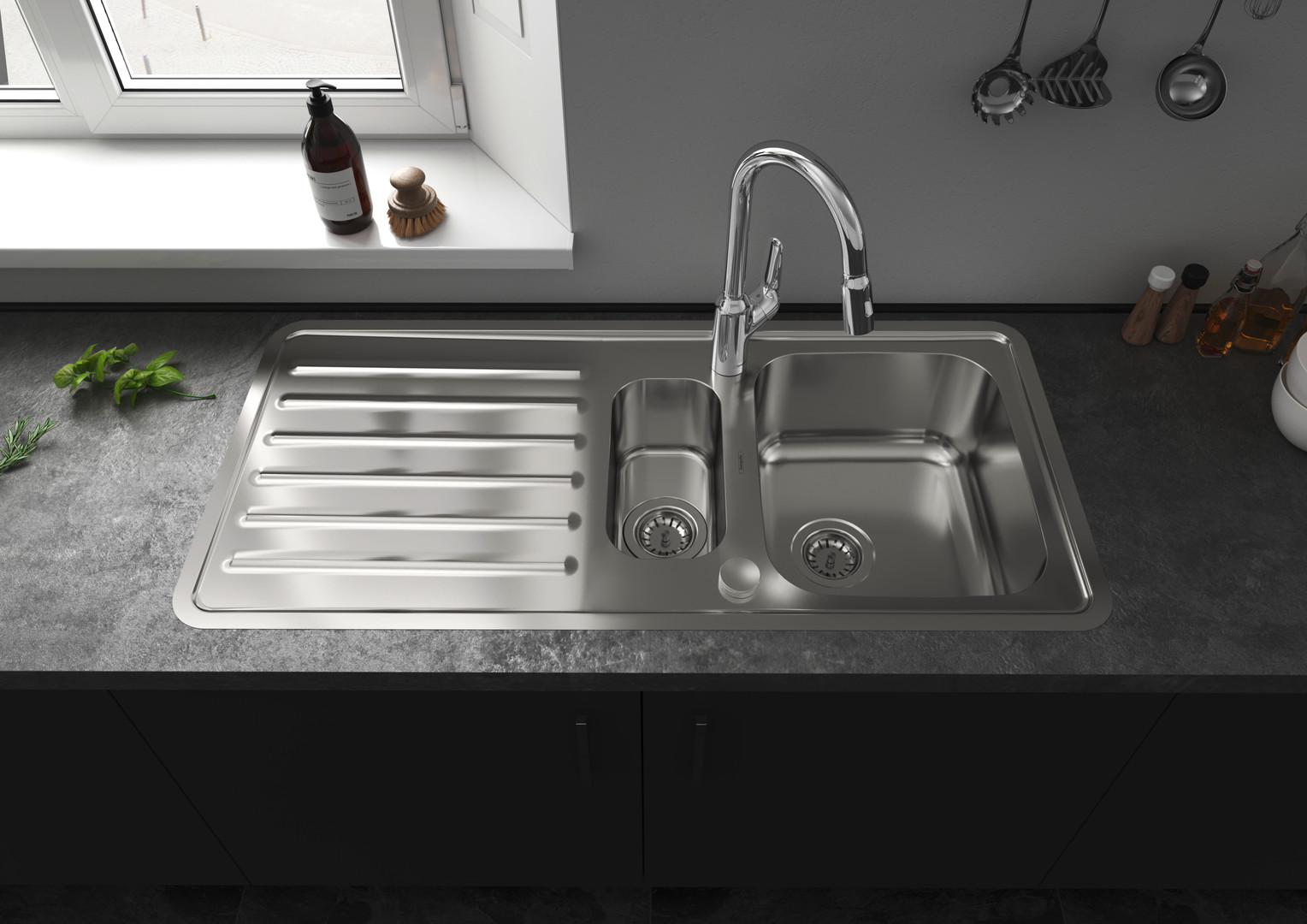 bestehend aus 1 Hauptbecken mit Abtropffläche, 1 Restebecken, automatische Ablaufgarnitur mit Siphon, Hahnloch und Loch für Ablauffernbedienung sind vorgebohrt, Ausrichtung ist reversibel, Beckentiefe 210 mm, Tiefe Restebecken 160 mm, Unterschrank 600 mm, Einbauart flach aufliegend oder flächenbündig, Position Überlauf ist seitlich im Becken unter Abtropffläche, Armaturenbankverstärkung für einen festen und stabilen Sitz der Armatur, Eckradius 70 mm