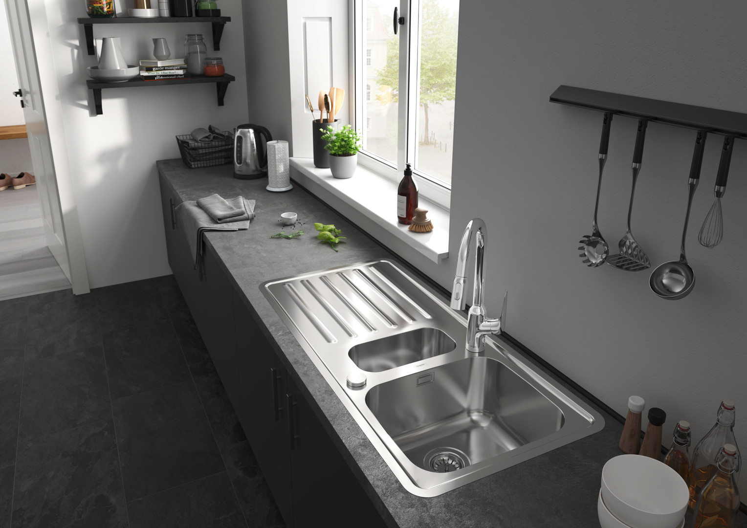 hansgrohe Einbauspüle S4113-F540 340/150/400 1055x485mm, mit Abtropffläche, automatische Ablaufgarnitur, Edelstahl