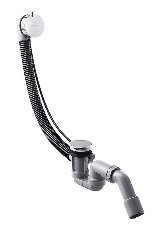 für Normalwannen, bestehend aus Grundkörper, Fertigset, PE-Verschraubung G 1 1/2 x 40/50 mm, flexibler Überlaufschlauch, Bowdenzuglänge 520 mm, Geruchverschluss, Stauwasserhöhe beträgt 50 mm