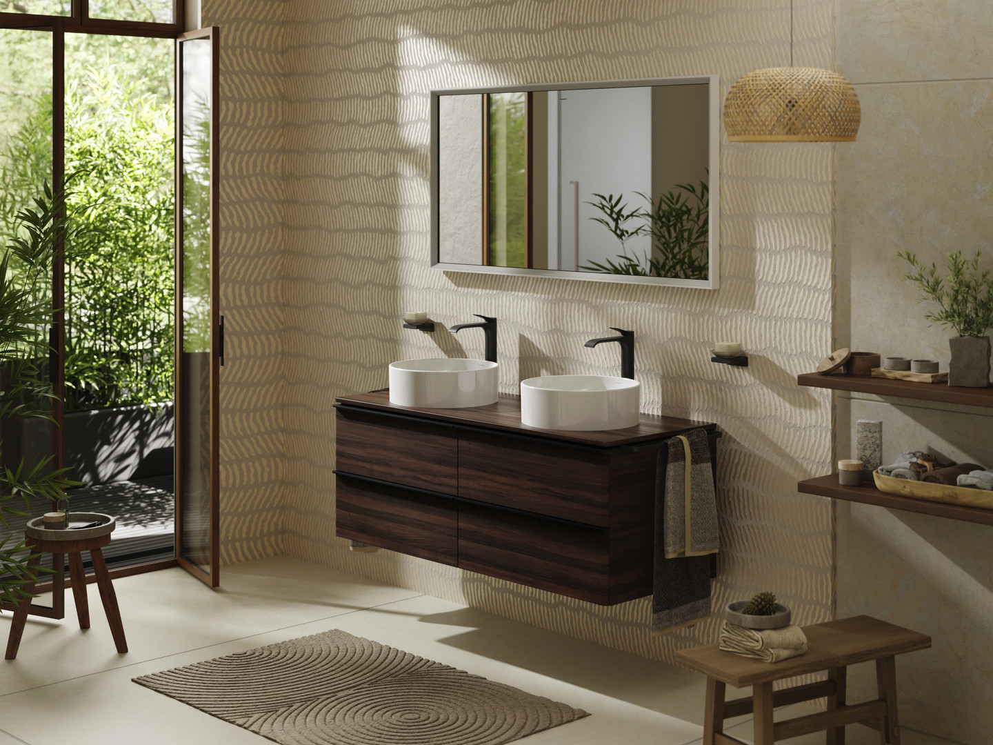 hansgrohe Konsole Xelu Q 1360 x 550 mm, 2 Ausschnitte, Aufsatzwaschtisch ohne Hahnloch, Nussbaum dunkel
