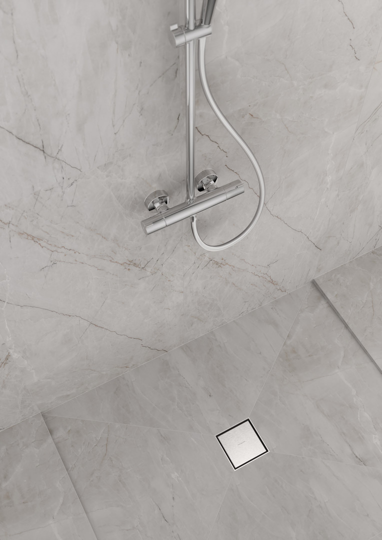 bestehend aus Punktablauf, Installationsset, Grundkörper, werkseitig vormontiertes Dichtvlies, Abdeckungsheber, Siphon, Bauschutzkappe, vormontierte Dichtmembran, rückseitig befliesbar, Sperrwasserhöhe bis zu max. 50 mm, Nenndurchmesser Anschluss DN 50, Richtung Auslass waagerecht, Anpassung an die Fliesenstärke durch höhenvertellbaren Rahmen (7-18 mm), Anwendungsbereich Neubau, Sanierung, herausnehmbarer Geruchsverschluss, dreh- und verstellbares Siphongehäuse, Abdeckungsheber ermöglicht Herausnehmen des Fertigsets, Art des Geruchsverschlusses flüssig, Mindestbauhöhe 79 mm, Höhe Grundkörper 59 mm, Material Siphon ABS, Montageart frei im Raum, kürzbares Siphon, Tiefe der Fliesenmulde 12 mm, Werkstoffgüte Abdeckung Edelstahl V2A (1.4301), geeignet für Primär- und Sekundärentwässerung, Quick Clean Antikalksystem