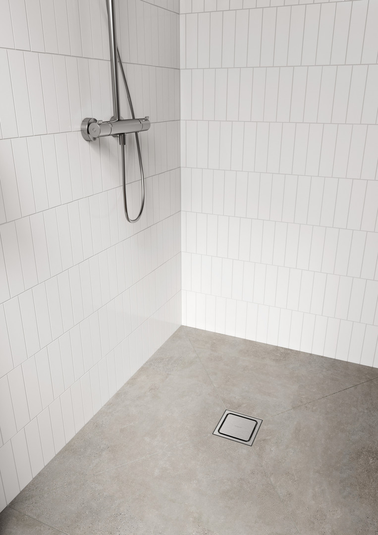 bestehend aus Designabdeckung, Grundkörper, Siphon, werkseitig vormontiertem Dichtvlies, Bauschutzkappe, vormontierte Dichtmembran, Sperrwasserhöhe 50 mm, Nenndurchmesser Anschluss DN 50, Richtung Auslass waagerecht vormontiert, senkrecht einsetzbar, höhenverstellbar um 10 mm, Ablaufleistung bis zu 35 l/min, Anwendungsbereich Neubau, Sanierung, herausnehmbarer Glockengeruchsverschluss, dreh- und verstellbares Siphongehäuse, Art der Gebrauchsverschlusses flüssig, Mindestbauhöhe 80 mm, Material Siphon ABS, Montageart frei im Raum, Werkstoffgüte Abdeckung Edelstahl V2A (1.4301), Quick Clean Antikalksystem
