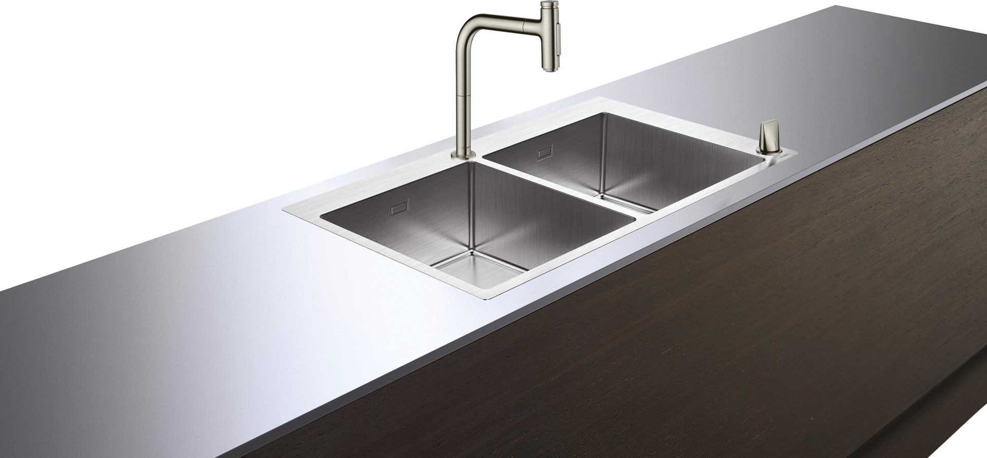 bestehend aus Einbauspüle, 2-Loch- Einhebel-Küchenmischer, Bedienelement, Schlauchbox, manuelle Ab- und Überlaufgarnitur, Material Spüle Edelstahl, Hahnloch und Loch für Bedienelement sind vorgebohrt, Beckentiefe 190 mm, Unterschrank 90 cm, Einbauart flach aufliegend oder, flächenbündig, Armaturenbankverstärkung für einen festen und stabilen Sitz der Armatur, Eckradius 10 mm, Durchflussmenge 8 l/min, für Durchlauferhitzer geeignet, Keramikmischsystem, MagFit magnetische Brausehalterung, mit Rückflussverhinderer, Schwenkbereich 150°, Laminar- und Brausestrahl, ComfortZone 200, Select-Knopf zum An- und Abstellen des Wasserstrahls, sBox für geschützte Schlauchführung im Unterschrank, Auszugslänge bis zu 76 cm, Quick Clean Antikalksystem