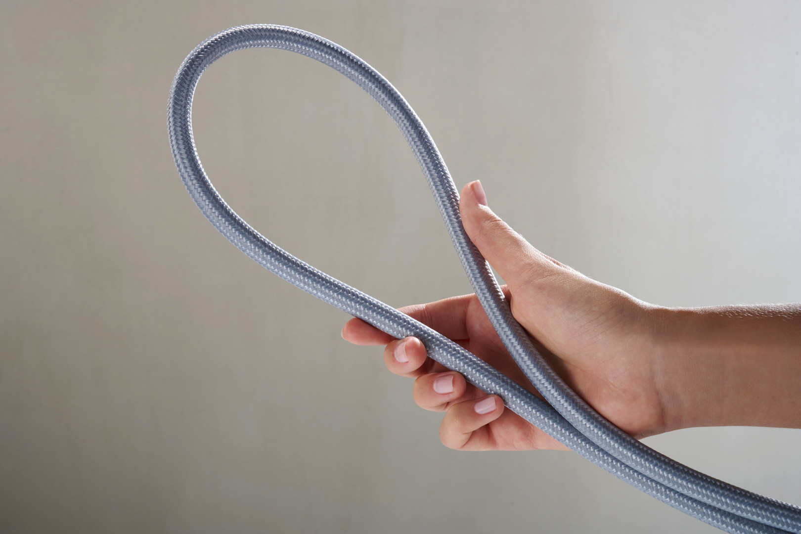 hochwertiger Textilschlauch mit Umflechtung, brauseseitiger Drehwirbel gegen Verdrehen des Brauseschlauches, knickgeschützt, wasserfestes und wasserabweisendes Material, die Garne sind aus recyceltem PET hergestellt, Design mit mehrfarbig geflochtenen Garnen, baumwollähnliches Material, spülmaschinenfest bis 60°C, Mutter Brauseschlauch 1x konische Mutter, 1x zylindrische Mutter, Anschlussgewinde G 1/2