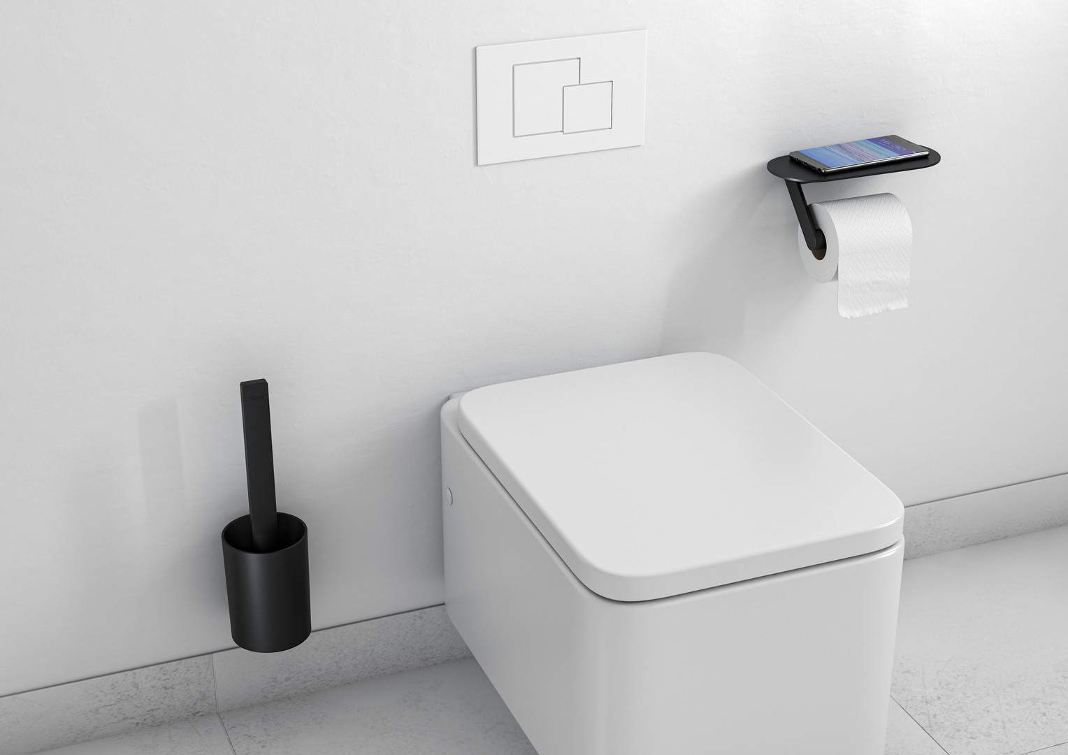 bestehend aus Toilettenpapierhalter, Toilettenbürstenhalter, durchgefärbter Kunststoff, Anwendung kleben oder bohren, mit Klebeset, verdeckte Befestigung