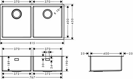 hansgrohe Unterbauspüle S719-U765 370/370 763x398mm, 2 Hauptbecken, ohne Hahnloch, Edelstahl