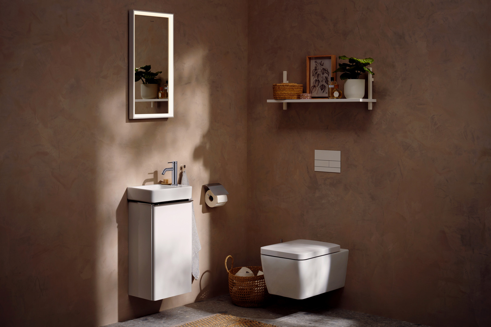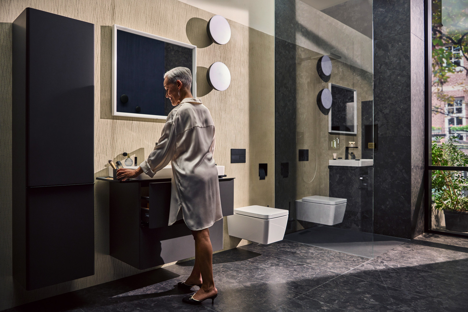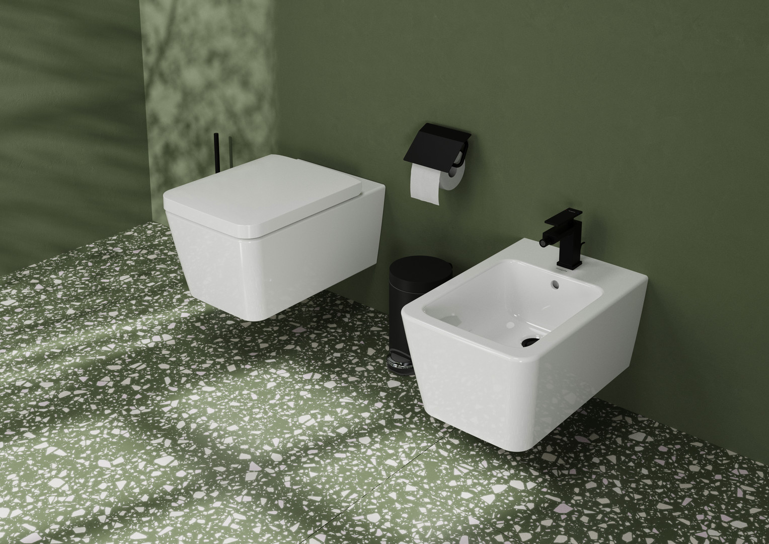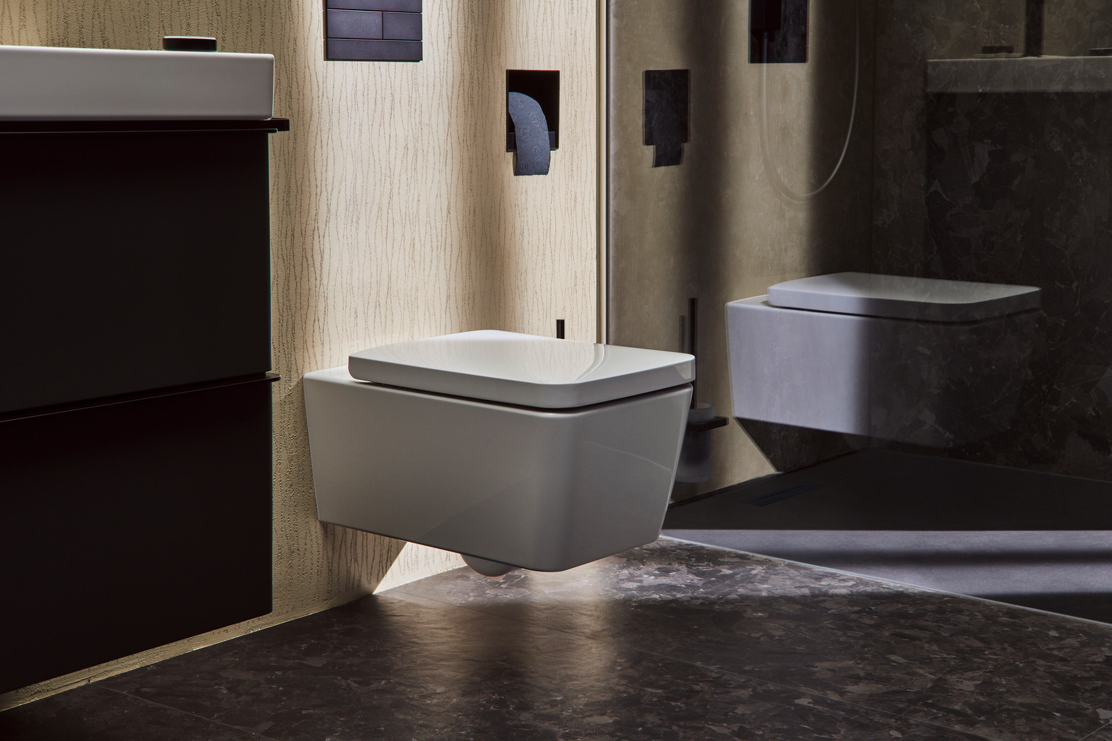 bestehend aus WC, WC Sitz, WC Deckel, Material Keramik, Urea, made to fit NoiseReduction Schallschutzmatte nach Maß, Glanzgrad glänzend, mit verdecktem Siphon, spülrandlos, Bedienung über einen Druckknopf, EcoSmart wassersparende Toilette (geeigneter Spülkasten erforderlich), Spülform tief, Einbauart Wandmontage, verdeckte Befestigung für WC, Wasseranschluss hinten