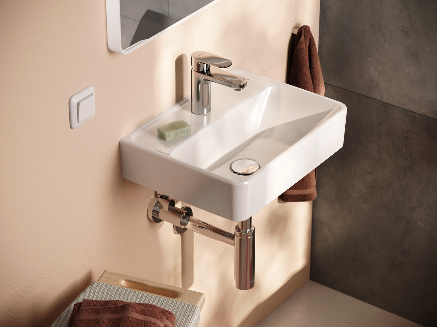 ComfortZone 100, Ausladung 108 mm, Auslaufhöhe 88 mm, Strahlart Normalstrahl, schwenkbarer Strahlformer, max. Durchflussmenge bei 3 bar 5 l/min, Keramikmischsystem, für Durchlauferhitzer geeignet, Zugstangen-Ablaufgarnitur G 1 1/4, Anschlussart G 3/8 Anschlussschläuche, Anschlussgröße DN 15, EcoSmart, AirPower Technologie