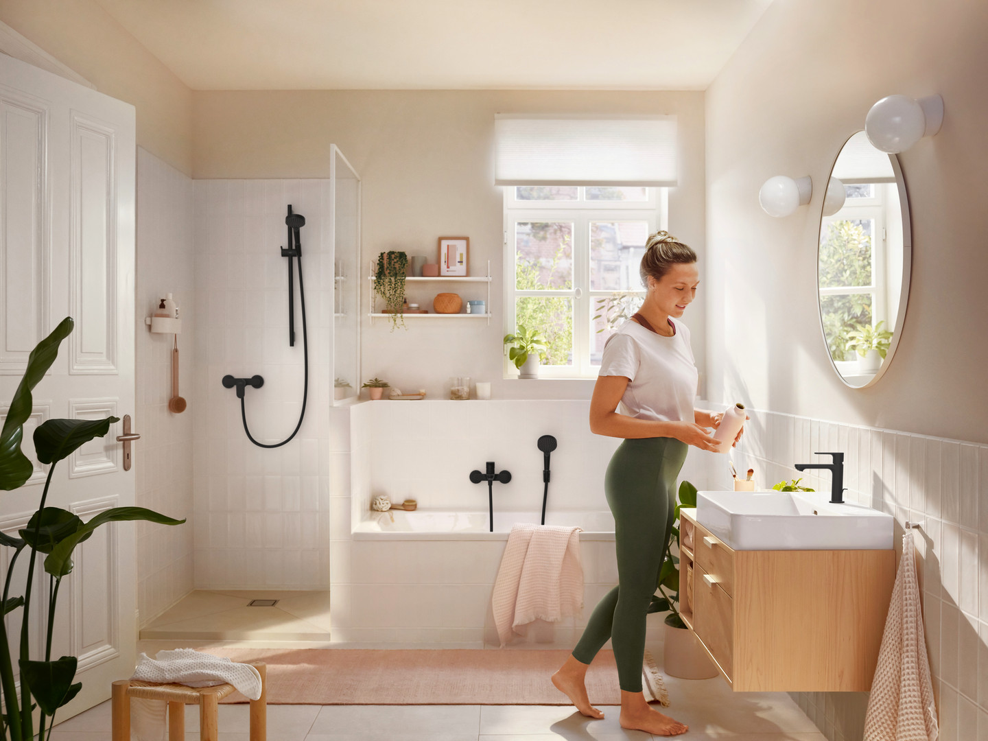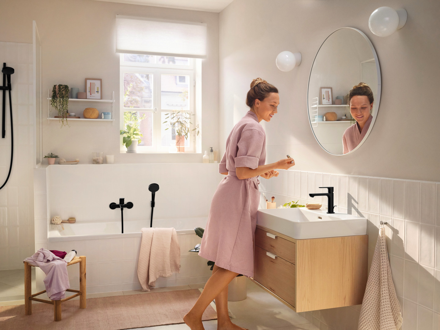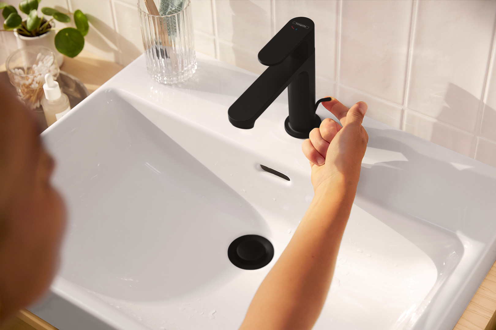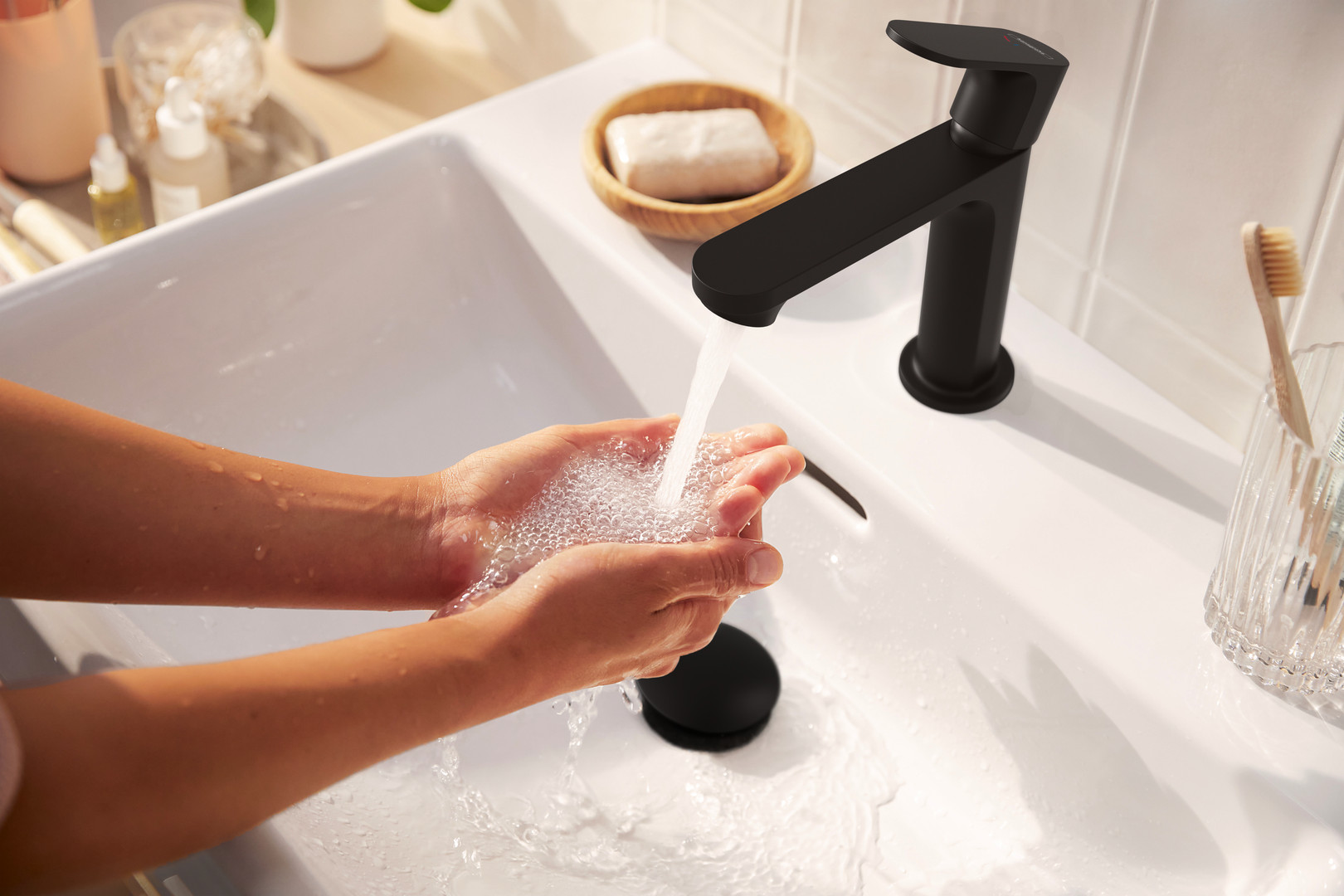 hansgrohe Waschtisch-Einhebelmischer Rebris S 110 CoolStart mit Zugstangen-Ablaufgarnitur, mattschwarz