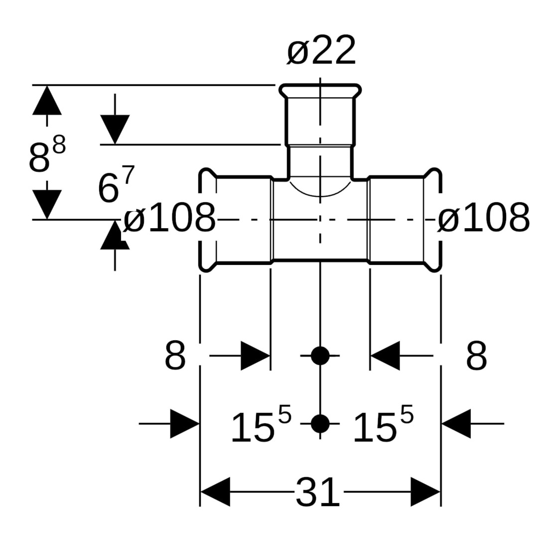 Geberit T-Stück Mapress Therm DN 100/20/100, Durchmesser 108/22/108 mm, 90Grad, reduziert