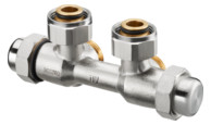 Flamco Zweirohr-Hahnblock UNIVERSAL G 1/2 M x G 3/4 F, mit Entleerung, mit Nippel und Konus, Messing vernickelt